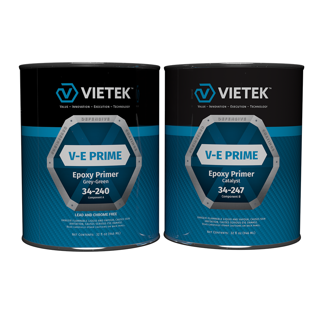VIETEK V-E Prime 2.1 VOC Epoxy Primer Sealer, 34-240 V-E Prime [Grey Green] provides superior adhesion, barrier characteristics, and corrosion resistance to a broad range of properly prepared substrates, such as metal, plastic, fiberglass, and fully cured OEM and refinish coating systems.